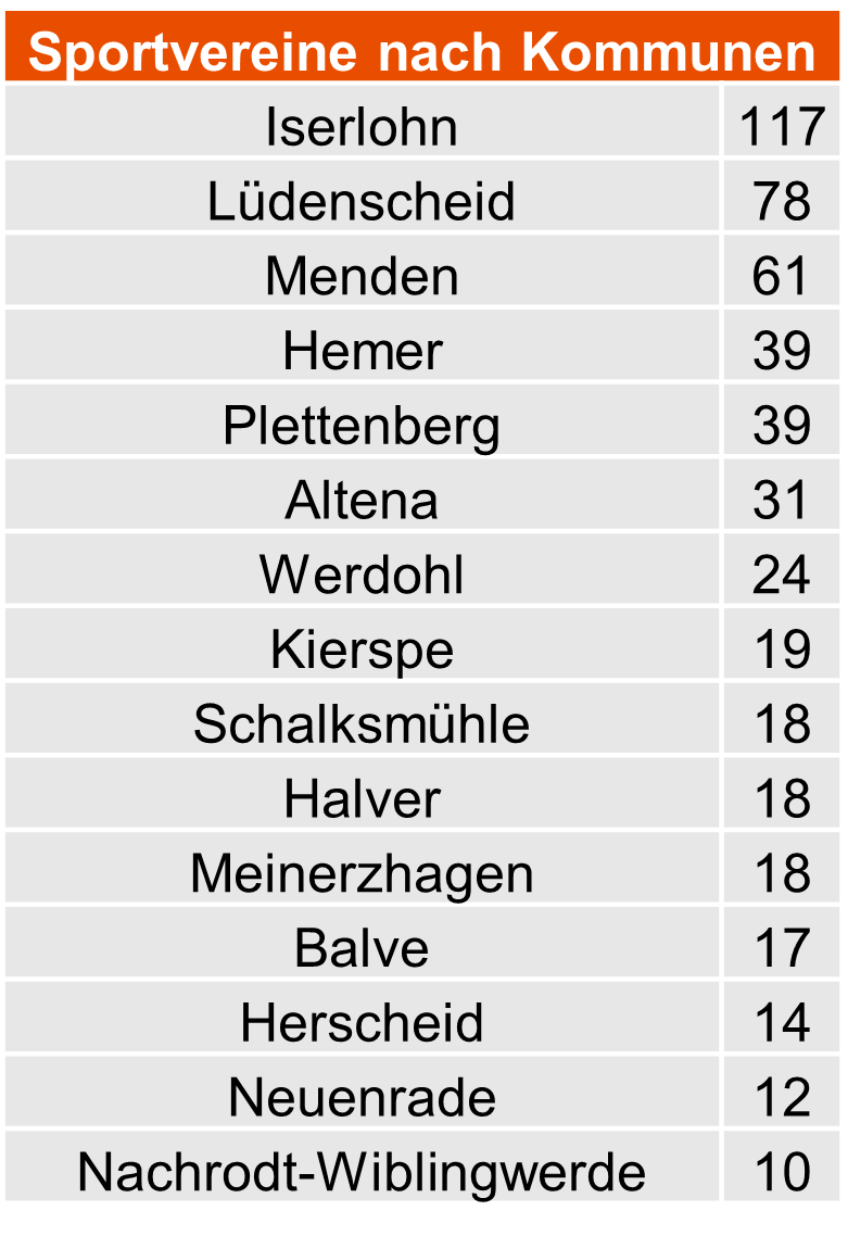 Wenn man sich die Charakteristika der Sportvereine genauer anschaut, ist es wenig verwunderlich, dass die meisten Sportvereine in den einwohnerstärksten Kommunen Iserlohn (113 Sportvereine) und Lüdenscheid (76 Sportvereine) beheimatet sind, dennoch zeichnen sich insbesondere die kleineren Städte und Gemeinden durch eine lebhafte Sportgemeinschaft aus. Laut der oben angesprochenen Auswertung ist die Sportvereinslandschaft im Märkischen Kreis mit insgesamt 57 gemeldeten Sportarten überaus vielseitig. Besonders hervorzuheben ist, dass im Märkischen Kreis das Turnen die stärkste Sportart (bezogen auf die Mitgliederzahl) ist und damit den für gewöhnlich populären Fußball auf Platz 2 verdrängt.