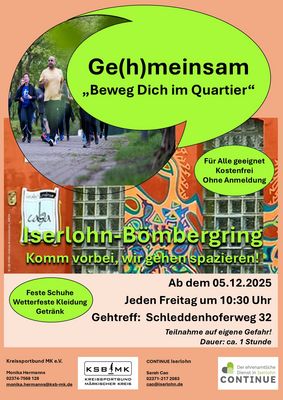 Ab dem 05.12.2025 startet am Bömbergring in Iserlohn ein weiterer Ge(h)meinsam-Standort mit geselligen Spaziergängen in gemütlicher Runde. Im Rahmen des Projekts "Ge(h)meinsam - Beweg dich im Quartier" treffen sich Spazierfreudige zukünftig also an fünf verschiedenen Treffpunkten. Die Teilnahme ist kostenlos. Mehr zu dem Projekt und den anderen Standorten gibt es hier.
