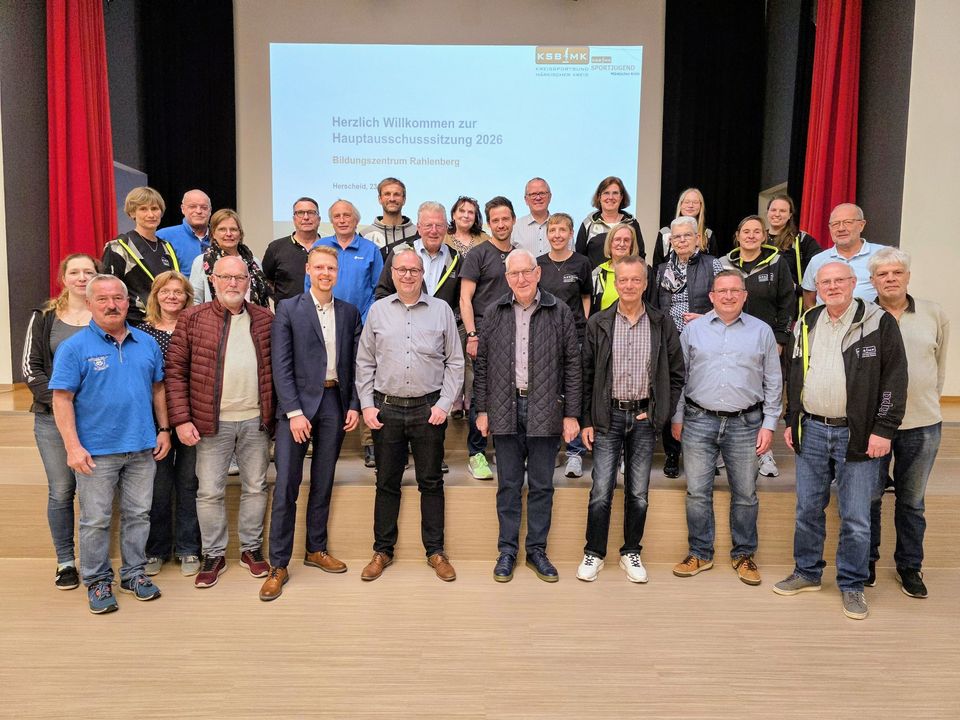 Alle aktiven Stadt- und Gemeindesportverbände des Märkischen Kreises sind am 23.04.2026 der Einladung des Kreissportbundes Märkischer Kreis e.V. gefolgt und haben sich zur Hauptausschusssitzung in der Aula der Grundschule Herscheid zusammengefunden. Diese überwältigende Resonanz freut uns, weil sie ein starkes Zeichen des organisierten Sportes ist.