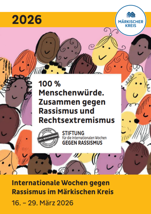 Der Märkische Kreis hat heute das Programmheft zu den Veranstaltungen im Rahmen der Internationalen Wochen gegen Rassismus 2026 im Märkischen Kreis veröffentlicht. Zum diesjährigen Motto „100 % Menschenwürde. Zusammen gegen Rassismus und Rechtsextremismus“ wird es ein breites und vielfältiges Angebot im Märkischen Kreis geben. Als Kooperationspartner sind Angebote des Kreissportbundes Märkischer Kreis e.V. auf den Seiten 33 und 43 zu finden. Gerne kann das Programmheft hier runtergeladen und auch gerne an Interessierte weitergeleitet werden. Weitere Informationen gibt's auch auf unserer Homepage auf den Unterseiten Internationale Wochen gegen Rassismus und Pink gegen Rassismus und natürlich auf Social Media.