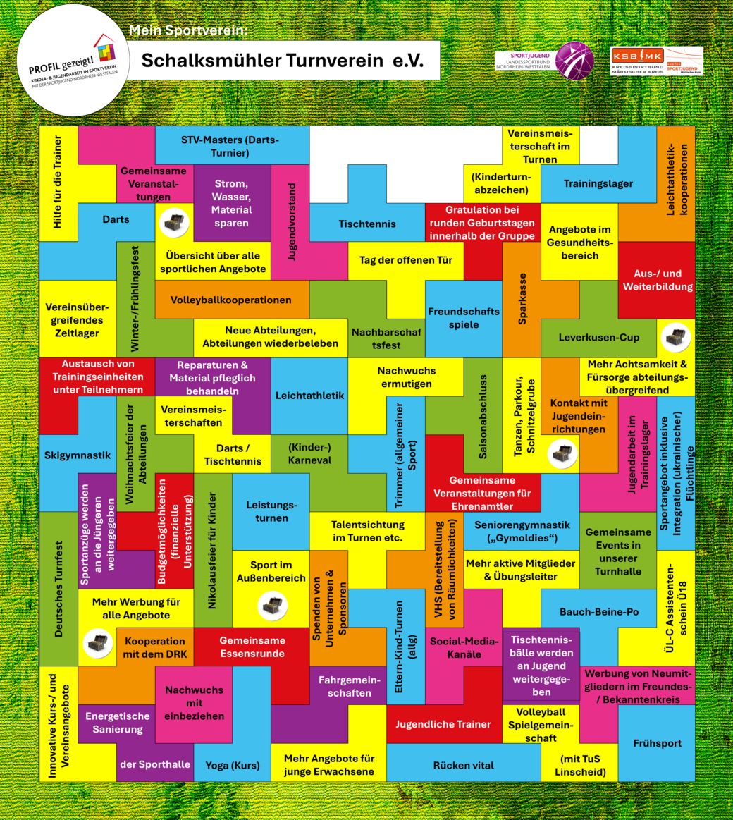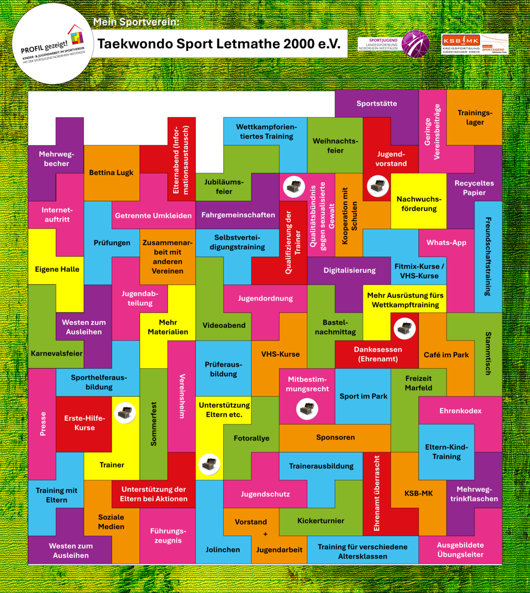 Die Methode "Zeig' dein Profil" nutzt ein Setzkastenprinzip inklusive vieler bunter Bausteine, um den Teilnehmenden des Vereins die Möglichkeit zu geben, wertschätzend auf die Arbeit ihres Vereins zu schauen. Der Verein wird hierbei in sechs Kategorien durchleuchtet und der IST-Zustand des Vereins gemeinsam niedergeschrieben. In der Folge wird sich über zukünftige Wünsche und Weiterentwicklungsbereiche des Vereins beraten. Ein individueller Einblick in die Unterstützungsmöglichkeiten - abgestimmt auf die zuvor bestimmten Wünsche des Vereins seitens des KSB-MK - als auch die Priorisierung der wichtigsten Bestandteile des Vereins (Schatztruhen) runden die Vereinsprofilierung ab und sind gleichermaßen Einstieg für eine intensivere Zusammenarbeit von Verein und Bund, um die Ziele des Vereins zu erreichen.