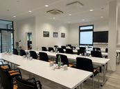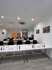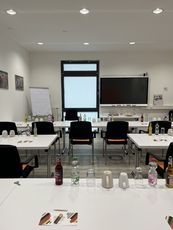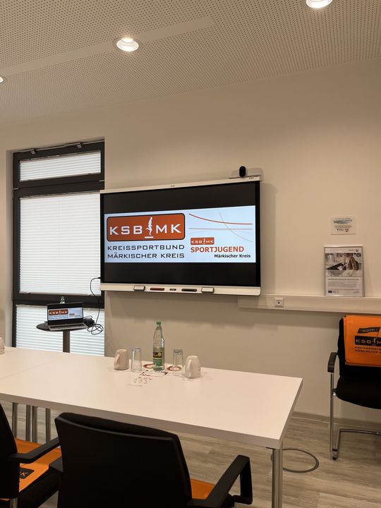 Das Herzstück der Geschäftsstelle des Kreissportbundes Märkischer Kreis e.V. ist der multimediale Schulungsraum, der nicht nur für interne Sitzungen genutzt wird, sondern sich auch für externe Interessenten als Ort der Zusammenkunft eignet. Das zur Verfügung stehende Mobiliar erlaubt verschiedene Tischanordnungen, sodass je nach Personenzahl Austauschrunden, (hybride) Qualifizierungen und Gesprächstermine stattfinden können.